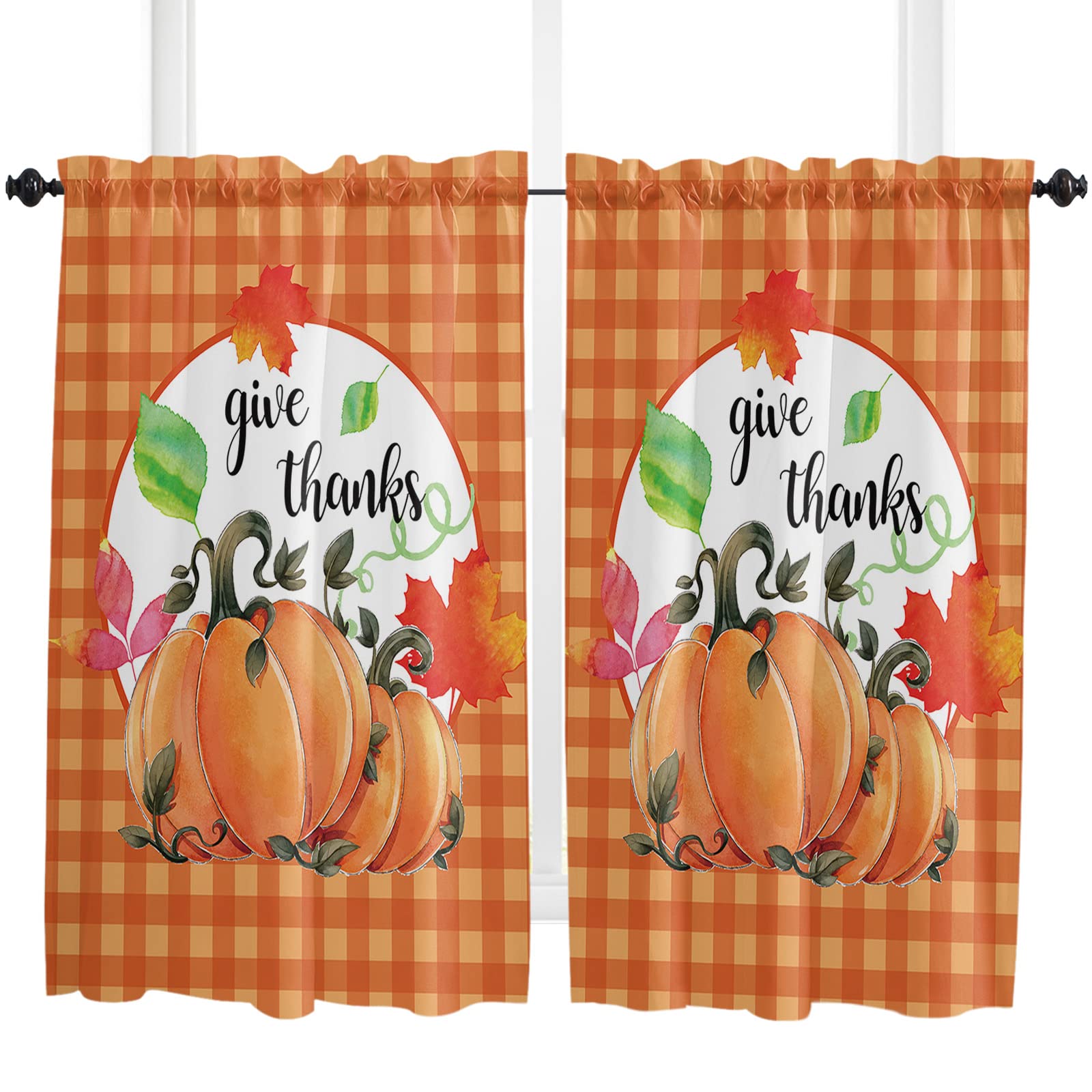 Amazon Com Kitchen Tier Curtains 2 Panels Fall Thanksgiving Maple Leaf Pumpkin Rod Pocket Cafe Curtain Light Filtering Valance Tiers For Bedroom Windows Farm Orange Buffalo Plaid Bathroom Short Window Treatment Home